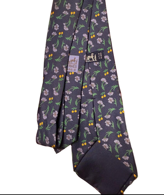 Hermes Mens Silk Tie Dark Blue Floral Fruit Pattern