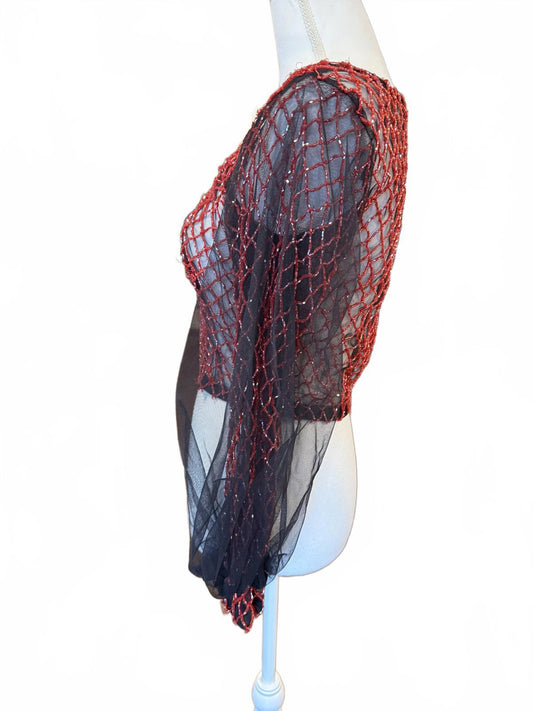 Nazila Couture Sheer Black Top with Red Beaded Overlay, Small