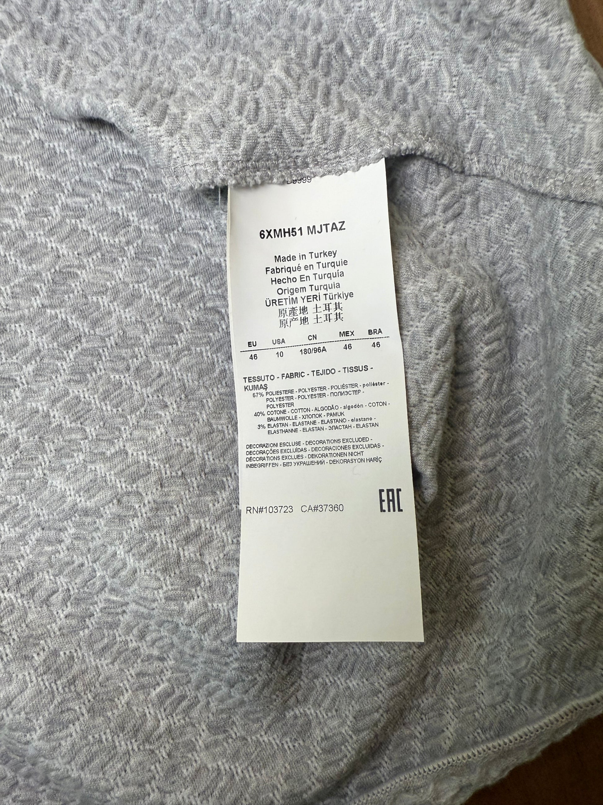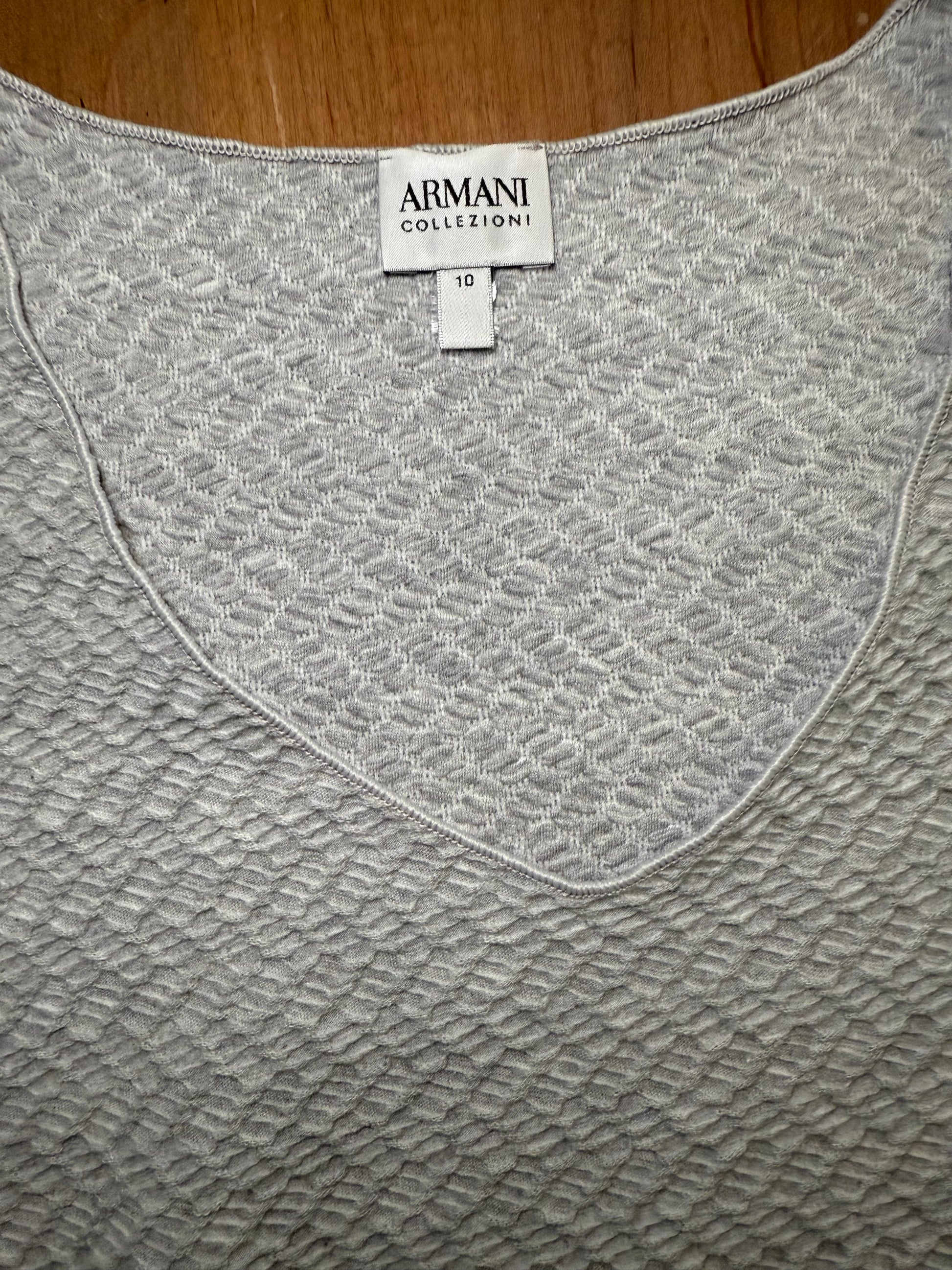 Introducing this sophisticated Armani Collezioni knit tank in size 10, the perfect foundation for countless chic looks. Crafted in a subtle grey with a unique diagonal texture, this sleeveless top features a flattering V-neckline and a comfortable stretch fit.