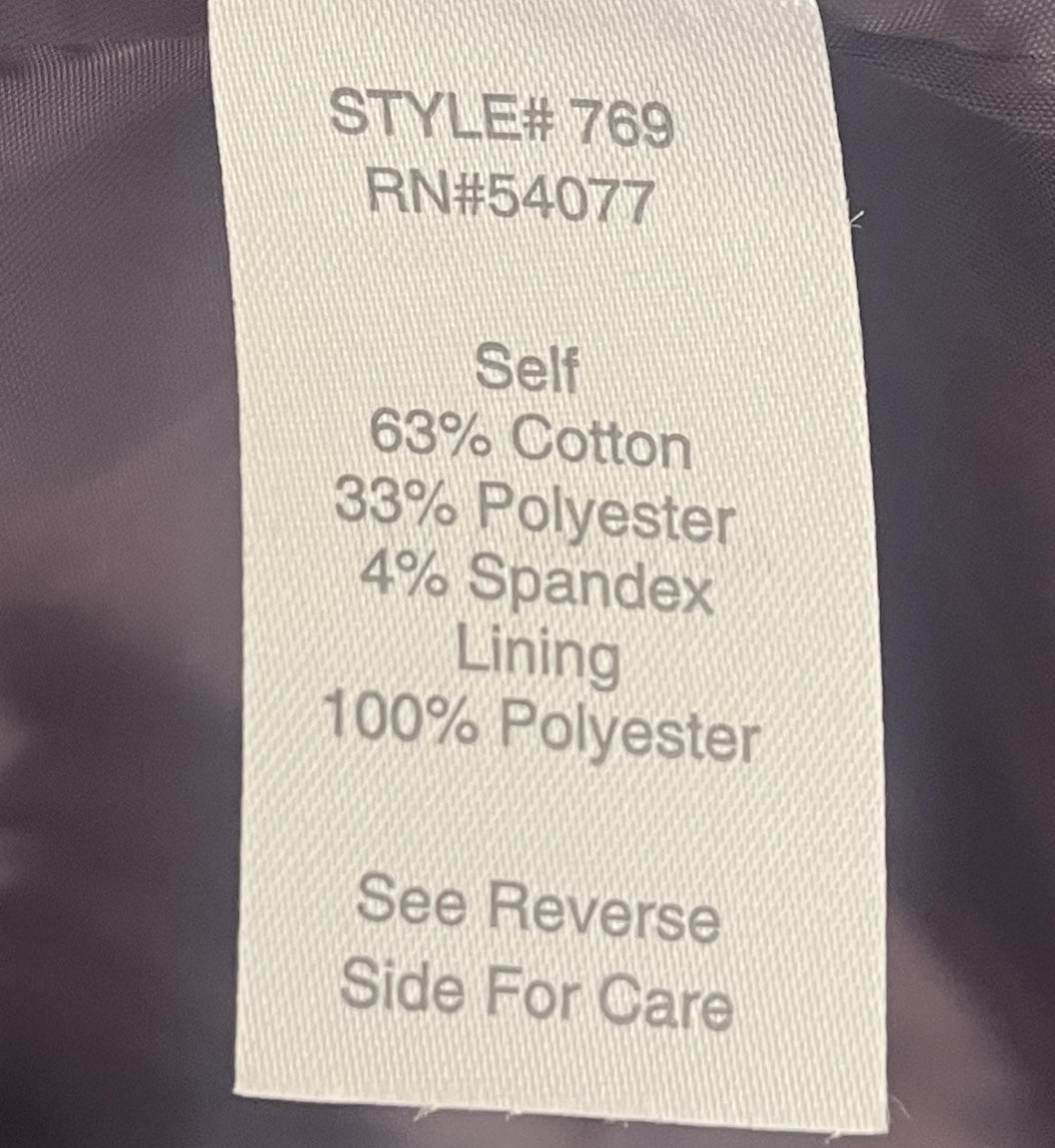 Material: Self: 63% Cotton, 33% Polyester, 4% Spandex; Lining: 100% Polyester