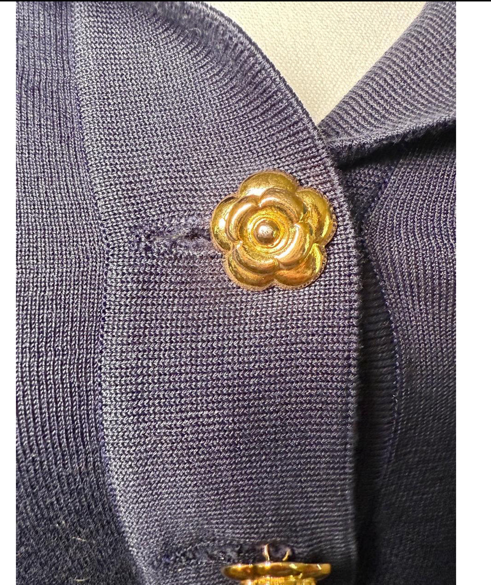 Classic and chic, this Chanel polo features the signature Camellia flower buttons in gold-tone detail for a refined finish. Designed with a collared V-neck placket and 3/4 length sleeves, it’s a versatile piece that works for both casual and elevated looks.