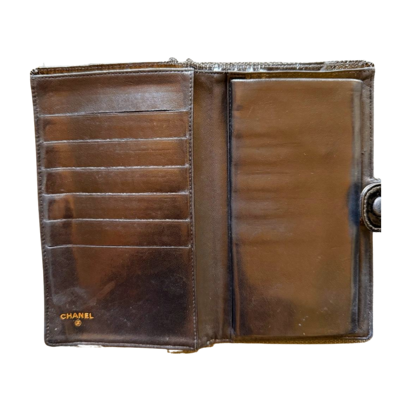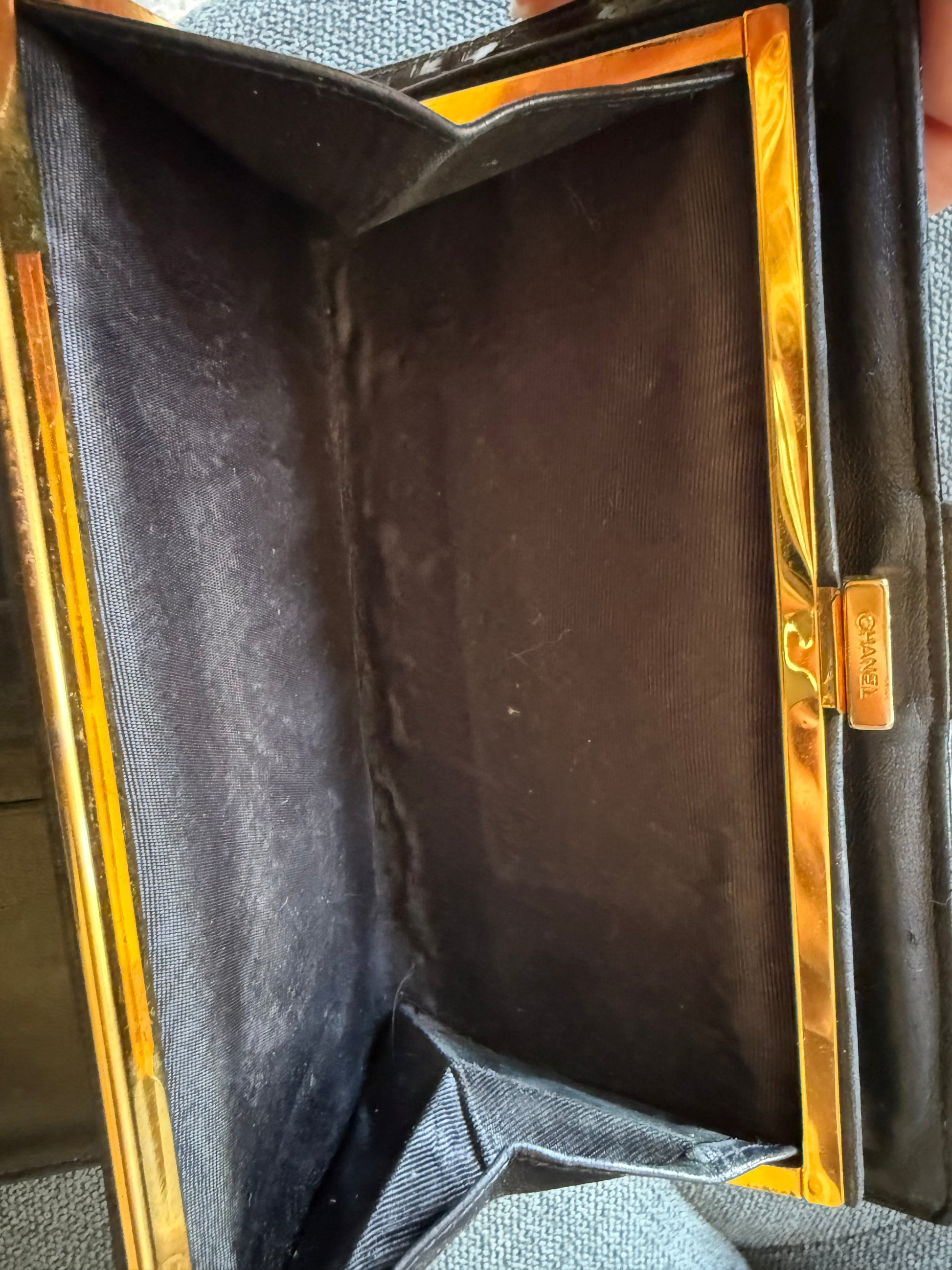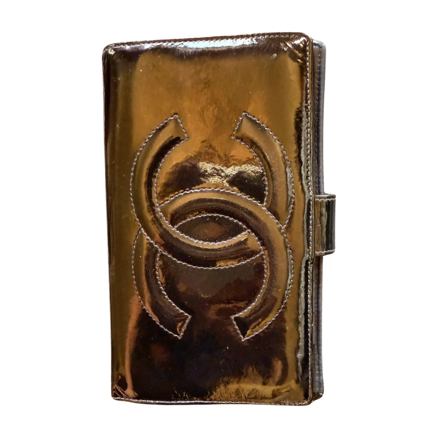 Chanel women's wallet made from black patent leather.