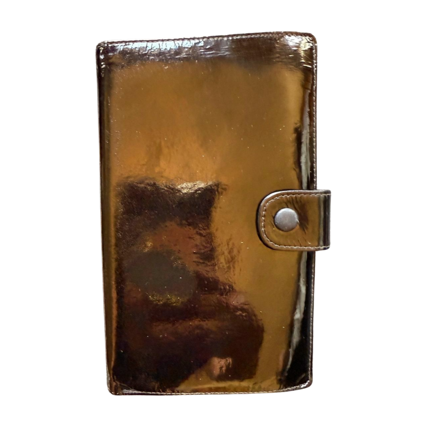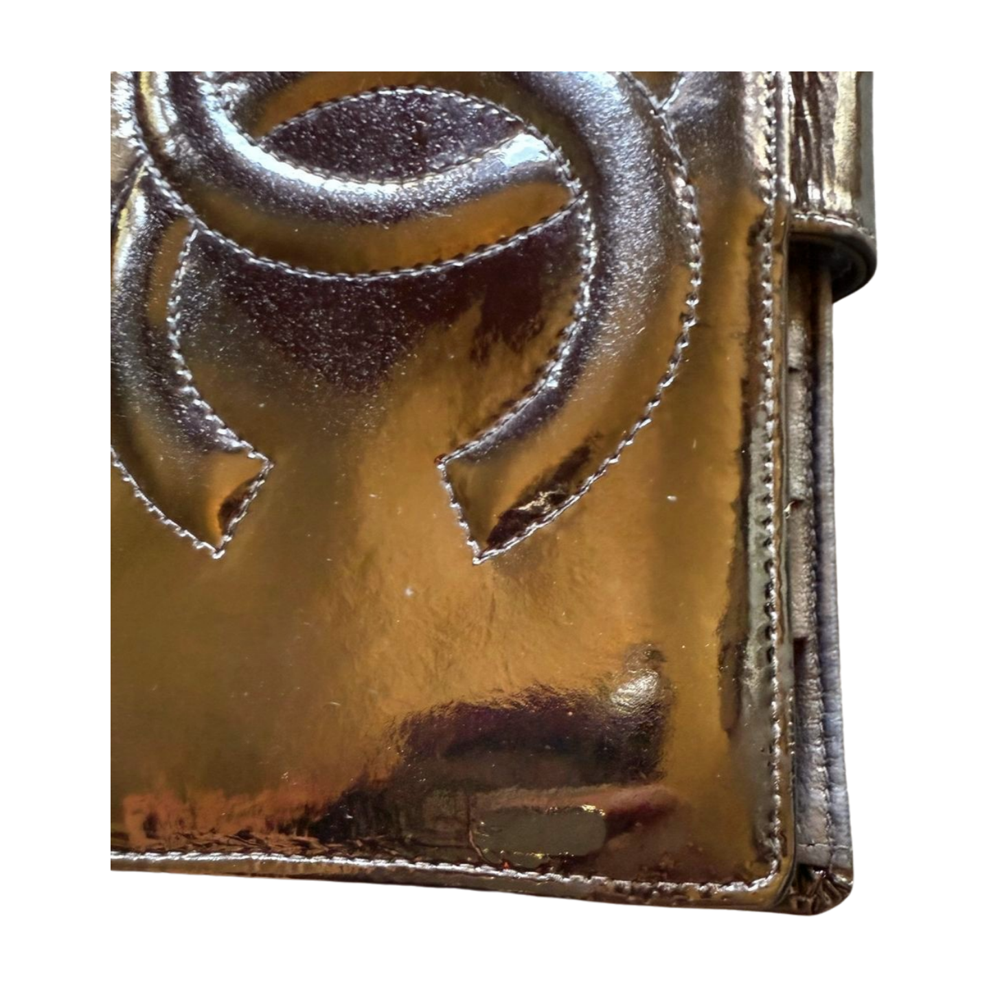 Has a couple of spots of wear on wallet and one corner shows wear of shine as pictured.