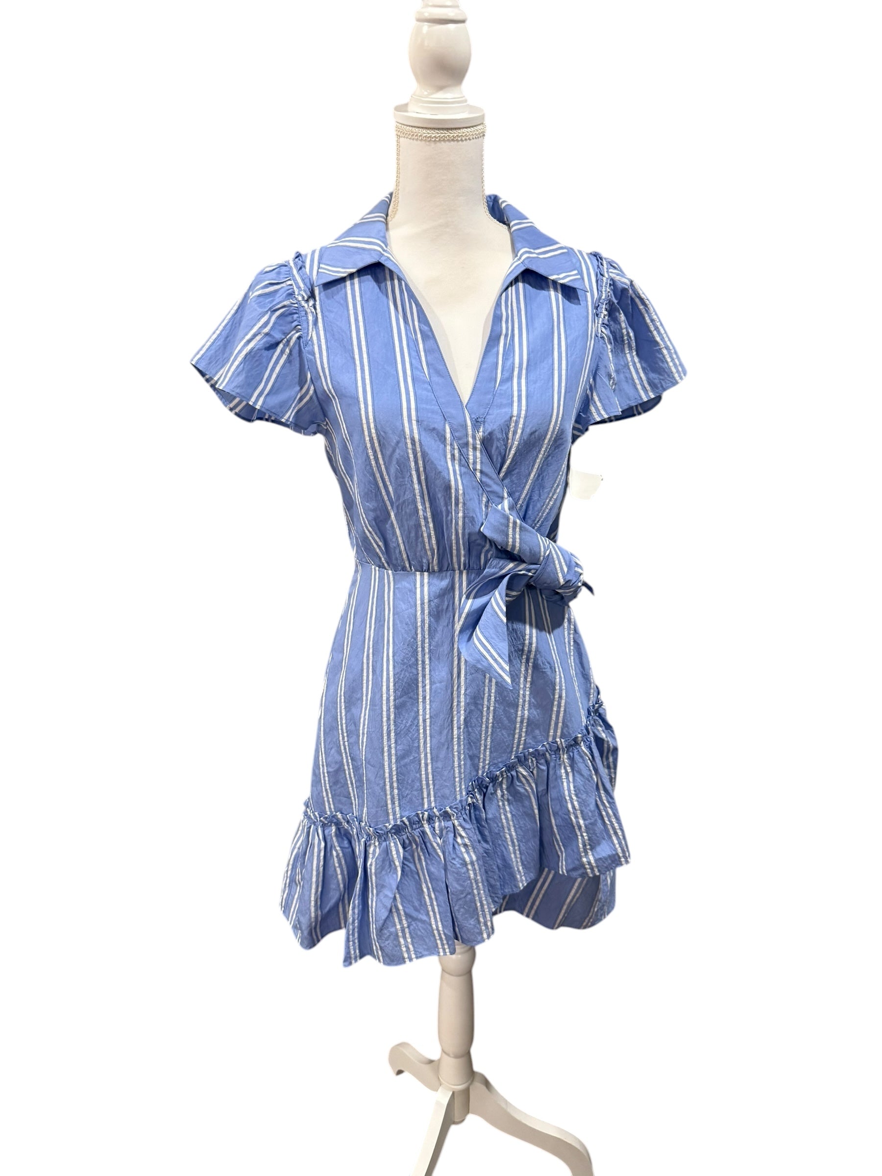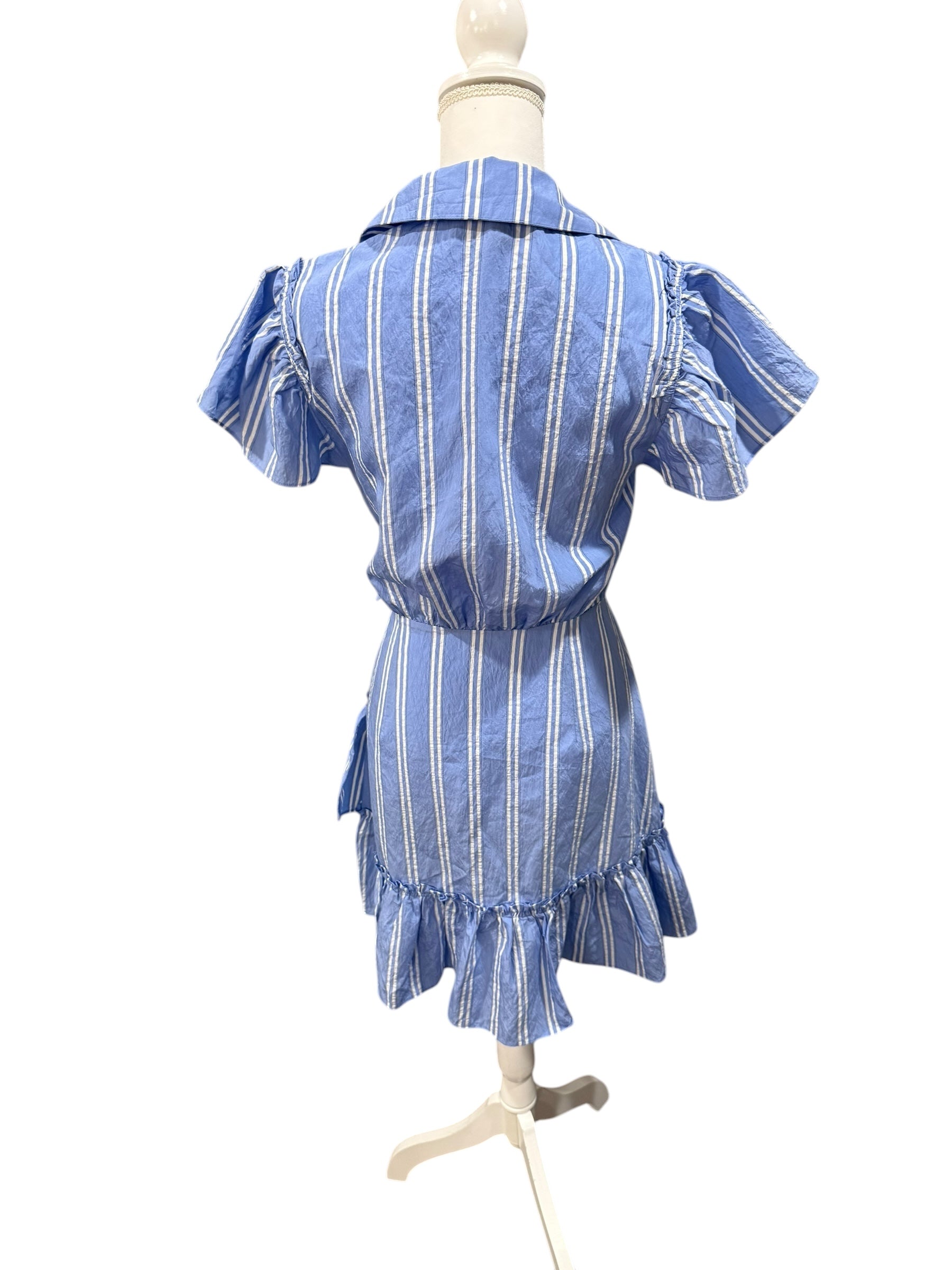- Style: Mini dress with ruffled hem, flutter sleeves, and tie-front waist