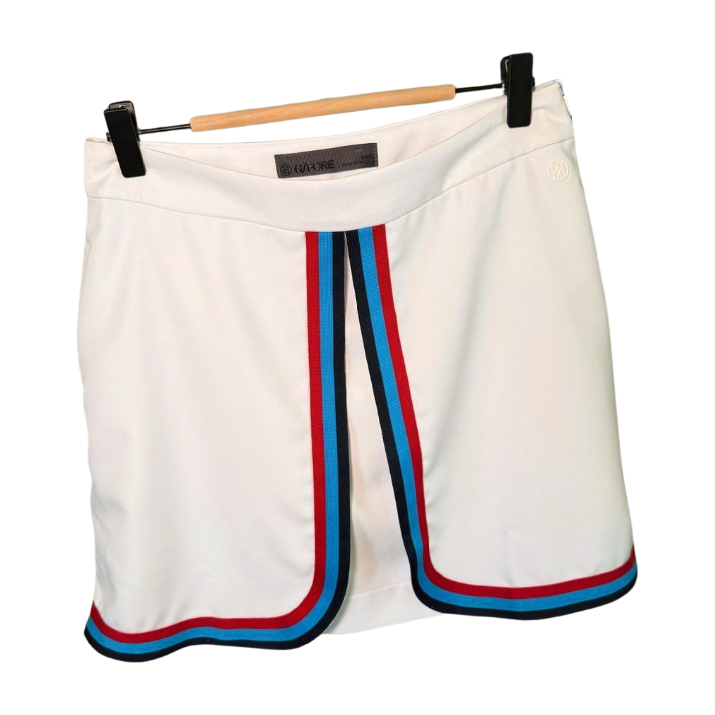 Bring bold style to the court (or course) in this G/FORE athletic skort featuring signature tricolor stripe detailing in red, blue, and navy against a crisp white backdrop. Designed for both performance and polish, it’s crafted from a lightweight stretch fabric with built-in shorts for comfort and mobility.