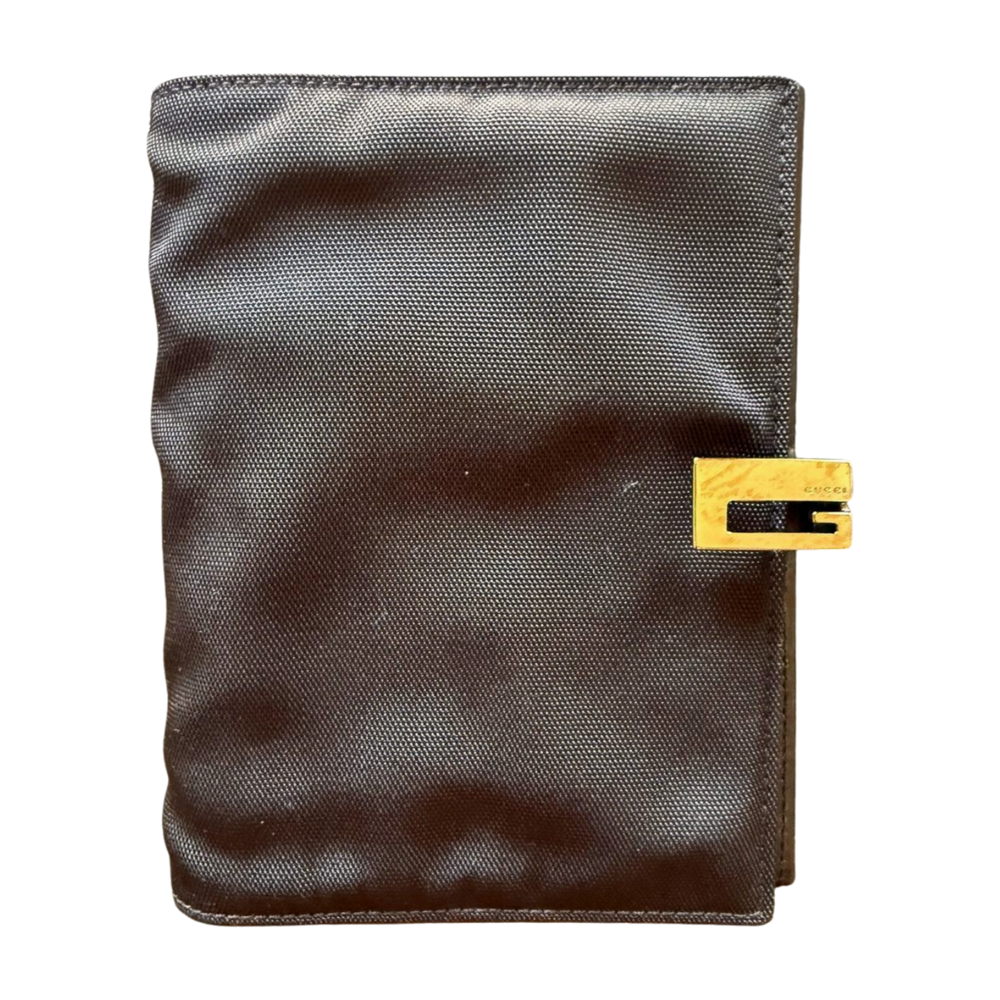 Elegant Gucci Planner and organizer wallet featuring a black nylon exterior with a smooth leather interior. The Gucci closure slides, really cool feature from the Tom Ford era at Gucci. Nylon wrinkled as shown in pictures.