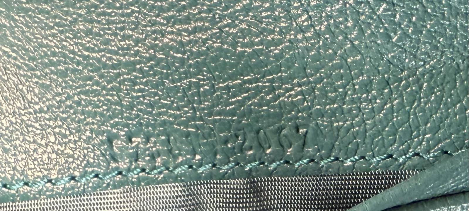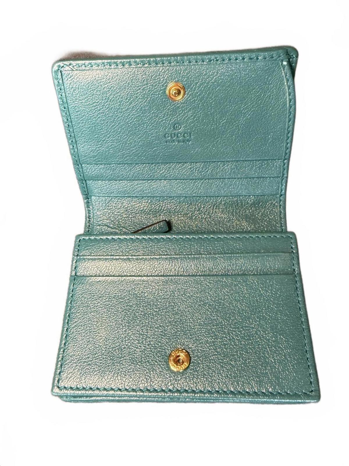 This wallet is like new, does not look used and features a quilted leather design in blue with green trim.