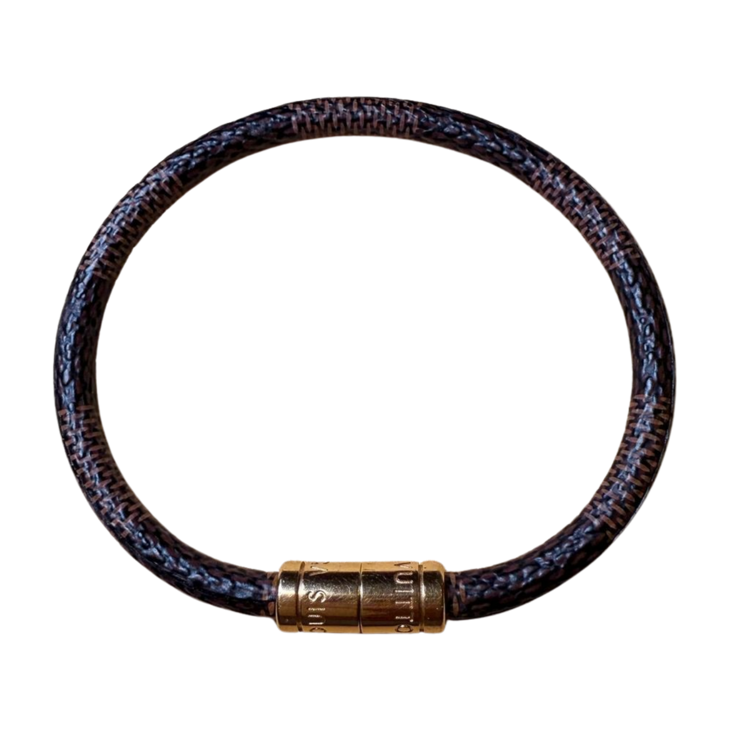 Everyday-luxe authentic LV bracelet in signature Damier Ebene canvas with engraved gold-tone clasp. Great solo or stacked.