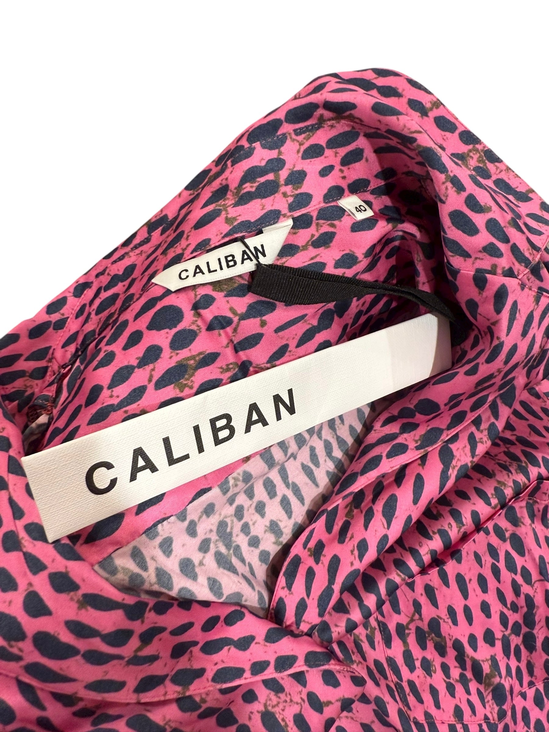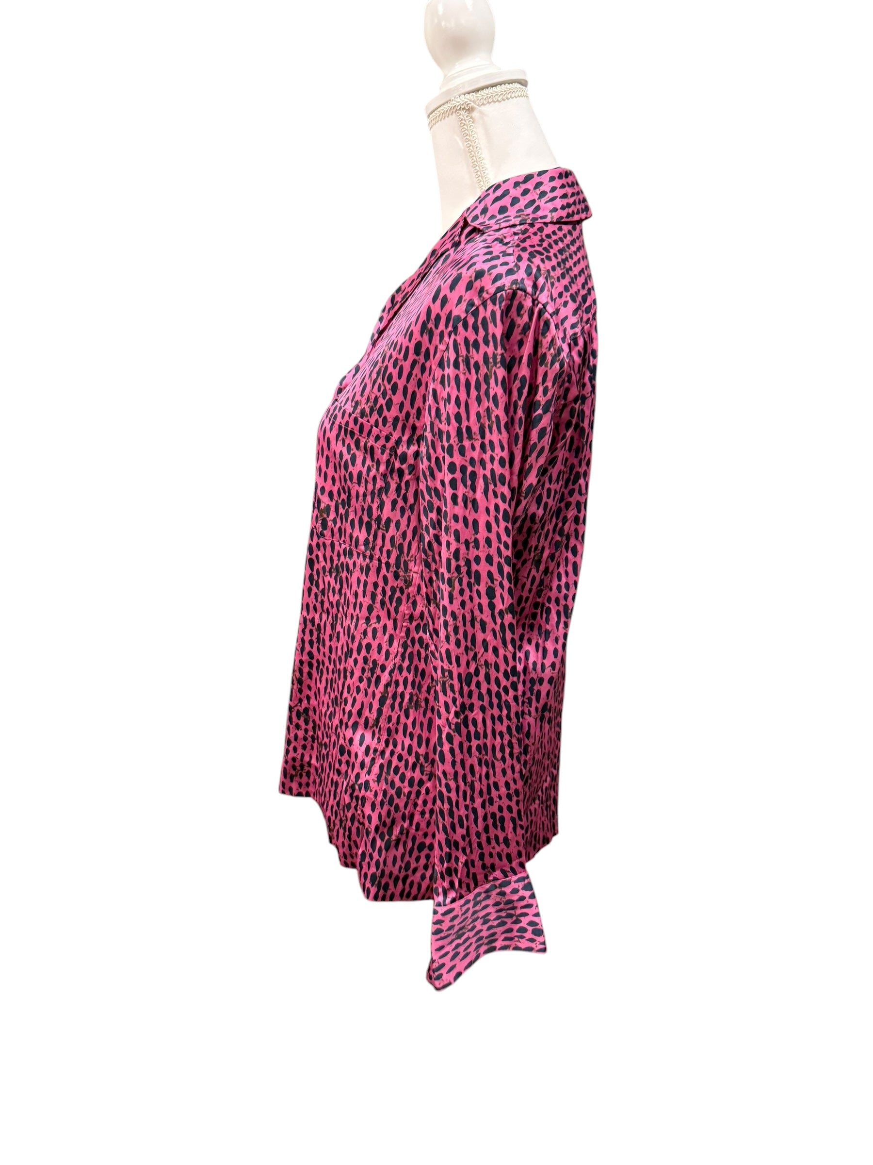 Bold, silky, and beautifully made in Italy, this Caliban blouse brings high-end European craftsmanship to a vibrant, statement-making silhouette. Featuring a stunning hot-pink base with abstract navy spotting, this top delivers an effortless mix of luxury and personality.