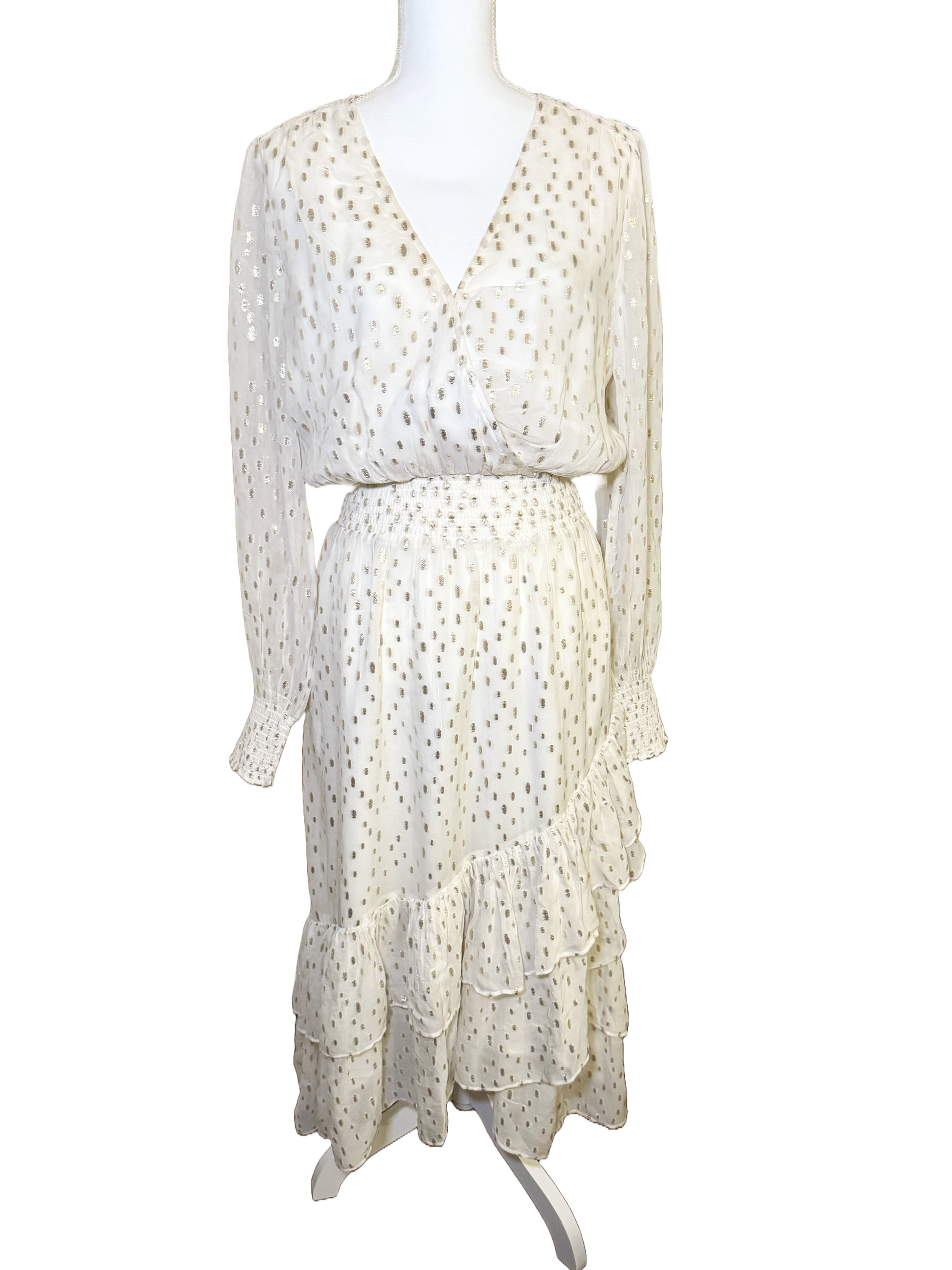Turn heads in this stunning wrap-style midi dress that blends effortless elegance with a touch of shimmer. The Cristiana features a flattering surplice neckline, smocked waist, and tiered ruffle hem — all with metallic slashes that catch the light beautifully. Perfect for weddings, holiday parties, or any moment that calls for a little sparkle.
