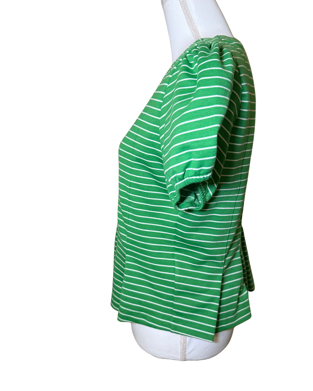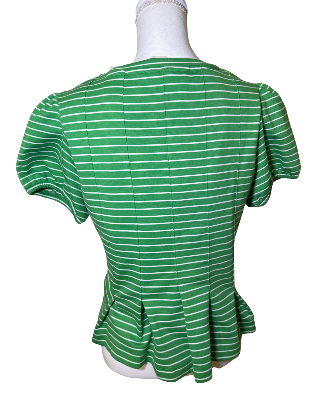 This gorgeous Maeve blouse brings playful charm and polished detail together in one standout top! Featuring green and white stripes, a corset-style peplum waist, and short puff sleeves, it’s designed to flatter and turn heads. Made from a soft, stretchy polyester-viscose-elastane blend, it offers comfort with structure and style.