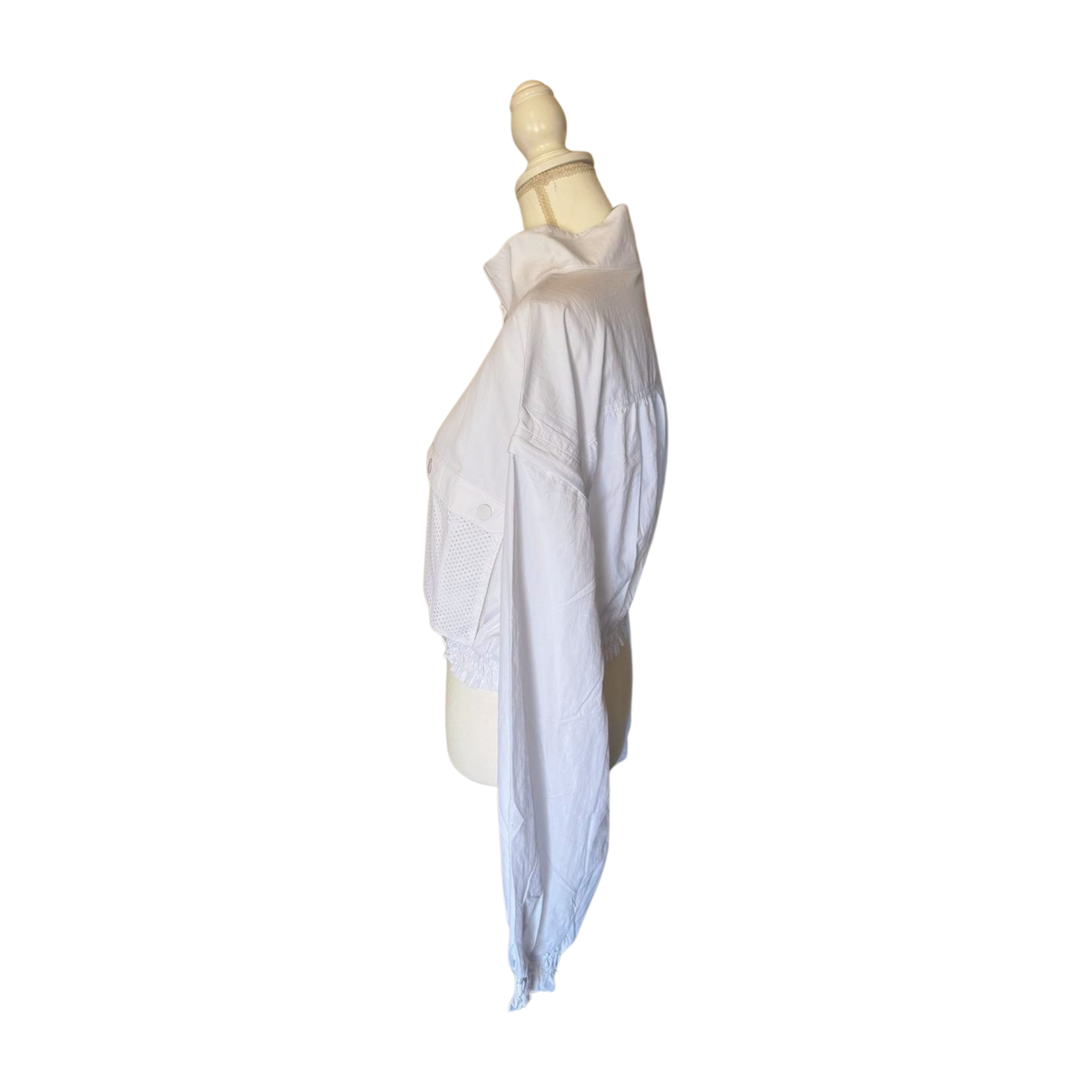 NWT Spiritual Gangster white utility jacket for women featuring a high collar and front zip closure, size medium and large available