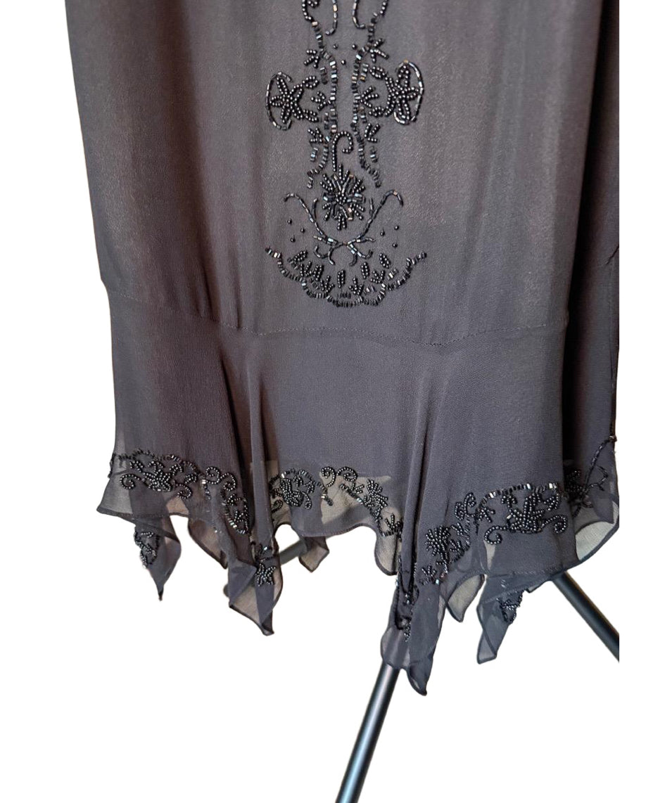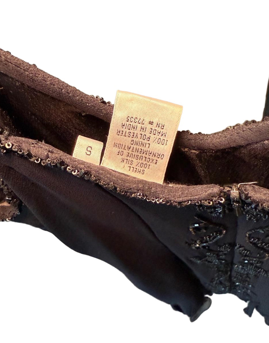 Womens Small Black Beaded Cocktail Mini Dress Spaghetti Strap Ruffled