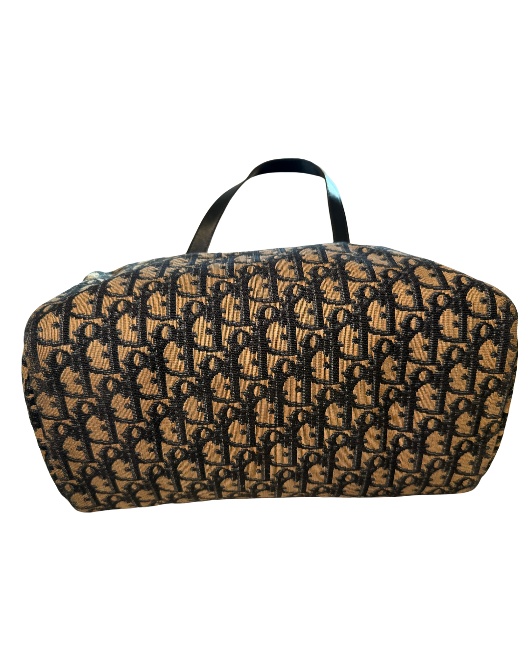 Step into timeless luxury with this authentic Vintage Christian Dior Boston Bag, featuring the iconic tan and navy Dior Oblique jacquard canvas. A true collector’s piece from the 1970s, this elegant travel or everyday carryall is styled with flat leather handles, gold-tone hardware, and the original Éclair zipper (note: pull is missing, but zipper remains functional with seam sealer applied for durability, though there is wear as shown). Update as of 8/18: NEW AUTHENTIC ZIPPER PULL ADDED. Please see pictures.